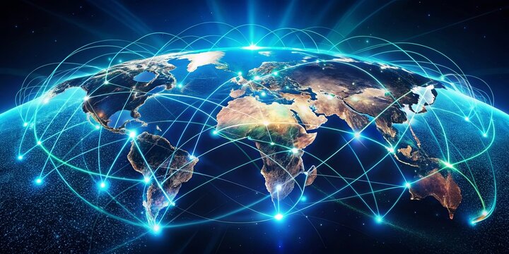 A luminous blue network of lines encircles a stylized earth, symbolizing the interconnectedness of global communication and information flow.