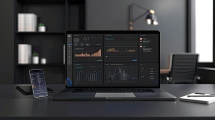 Laptop on table displays interface with analytics, graphs and charts in front view. The backdrop is a gray office space with black accents. On one side is a smartphone.