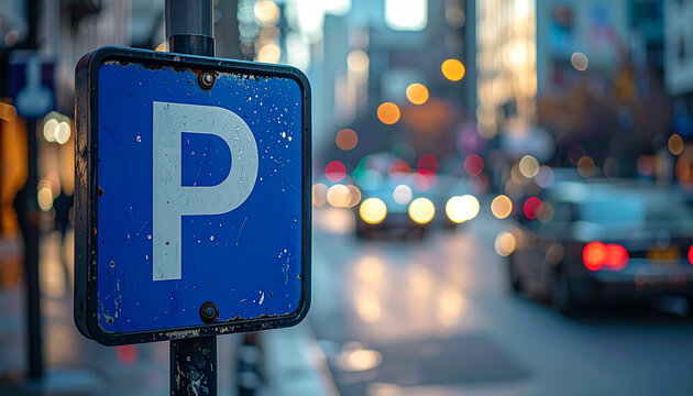 Blue metal parking sign with white P symbol, blurred cars and city traffic on background, urban