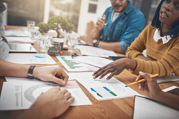 Business people, hands and office meeting graphs of SEO team with paperwork for website content update. Chart, conversation with brainstorming, stats and information with teamwork and collaboration