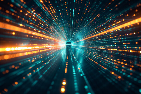 Digital grid with geometric shapes and light spots representing data flow