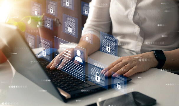 Protecting herself from cyber attacks. Documents confidentiality,cyber security protection concept. Software for security, searching and managing corporate document and employee information.