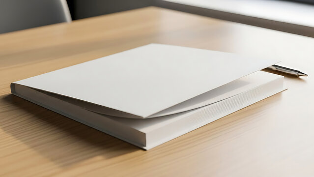 Blank white hardcover book and a sleek pen resting on a warm wooden desk, an ideal setup for design mockups, new ideas, creative writing, professional planning, or personal journaling