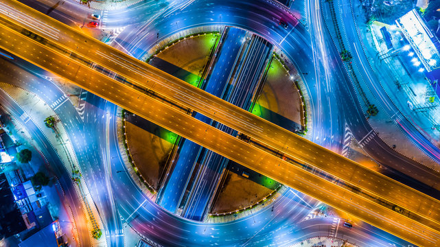 Futuristic HUD satellite view of traffic surveillance on a busy expressway junctions tracking and monitoring highway traffic for possible target vehicle