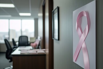 Corporate Support for Awareness: A corporate office scene where employees are wearing pink ribbons on their business attire. There is a desk in the foreground with informational pamphlets about breast