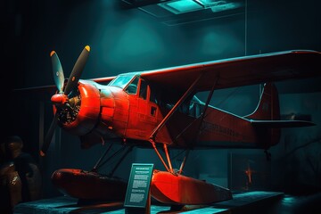 Aviation museum display featuring a vintage propeller plane with copyspace, informational plaques visible.