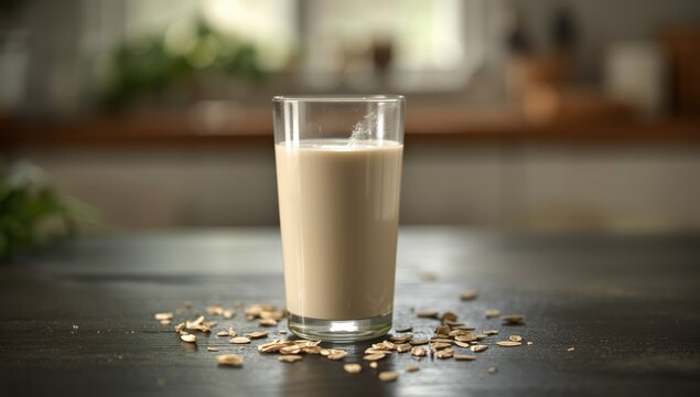 Oat milk substitute placed on plain backdrop for editorial use and informational graphics, plant-based product focus