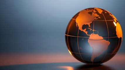 A 3D globe with orange lighting and grid lines on a reflective surface against a gradient background.