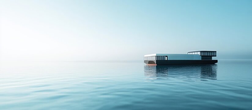 Ferry boat docking in tranquil waters with floating containers showcasing empty space for advertising or informational text.
