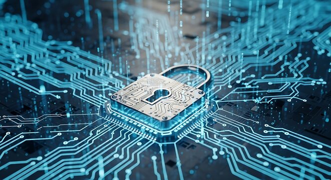 Data protection technology concept: A glowing red padlock serves as a focal point within a dynamic digital landscape of blue illuminated circuit pathways and nodes, representing secure network connect