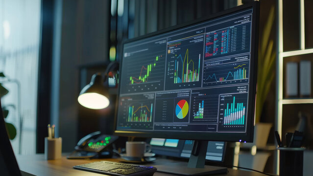 Dual monitors displaying vibrant financial graphs and data in a dark office.