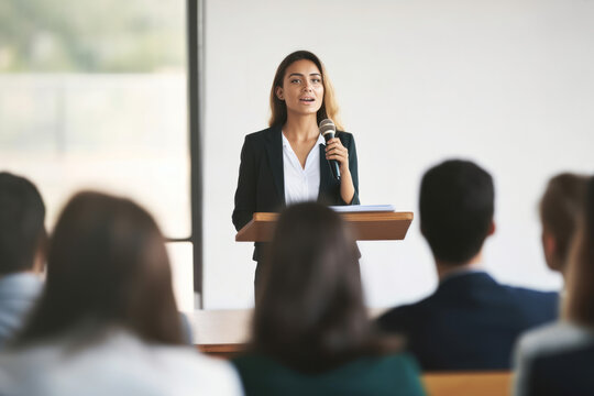 A confident female executive masterfully delivers a business presentation in a boardroom, engaging her audience during an informative workshop