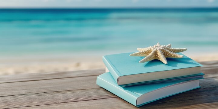 educational brochures, educational ocean brochures displayed on a wooden table with sharp text and graphics, ocean backdrop blurred in the background