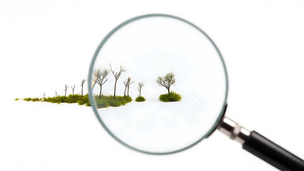 Magnifying glass over small trees and green moss, representing environmental observation and videos