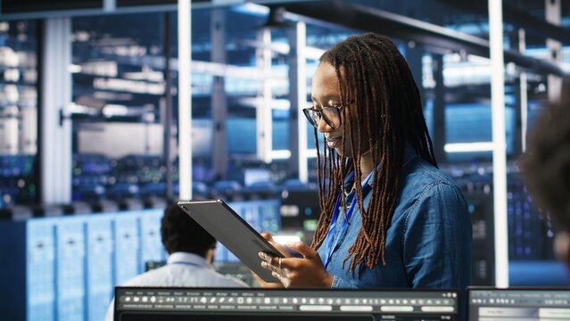 Worried Technician Facing Critical System Error. A concerned female technician in a server room, looking at a 'Critical System Error' message displayed on a computer screen, indicating a major technic