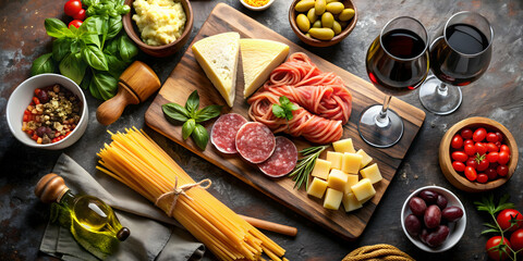 Italian cuisine ingredients spread on stone table pasta, cheese, salami, olives, wine , Italian, cuisine, food, ingredients