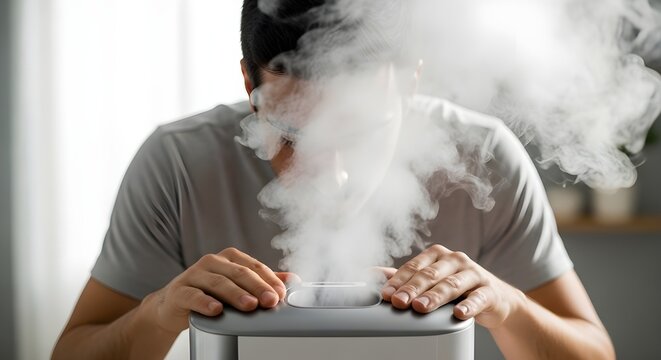 Man using a steam inhaler for respiratory relief and sinus congestion at home
