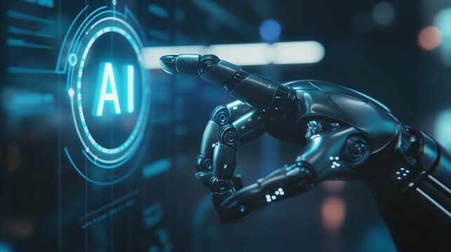 AI robot hand touching an interface hologram button, showcasing futuristic digital technology, innovation in programming, and advanced software system interactions