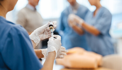 Doctor preparing vaccine with syringe and vial in clinical setting