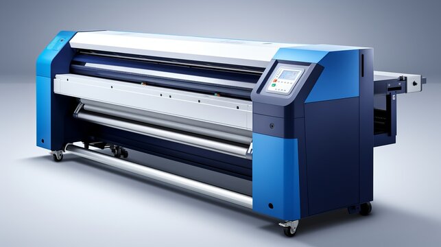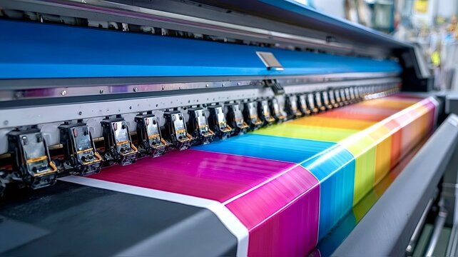 Industrial large format inkjet printer producing vibrant colorful prints on various media like fabric, PVC, paper. High-speed technology for creating billboards, posters, banners, graphics with sharp