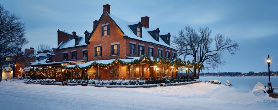 A historic brick inn located on a snowy waterfront, its facade adorned with festive lights and greenery, offering warm, welcoming lodgings for winter travelers