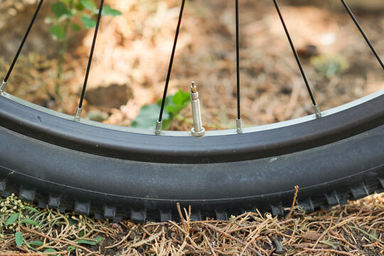 Inner tube valve on a wooden workshop table. Accessories for vulcanizer for repairing inner tubes and car tires.