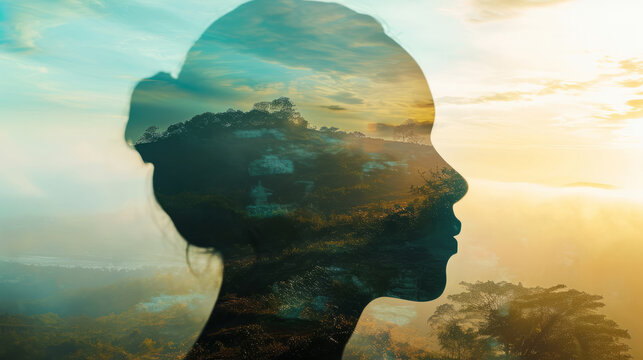 Outline of a human head containing a serene landscape background, symbolizing the concept of inner peace and mental tranquility with copy space