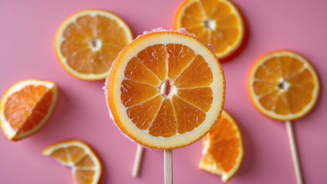 Orange fruit slices on pink background with lollipop stick showing juicy inner sections and additional cut slices scattered around Copy Space