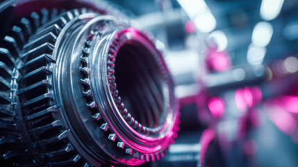 Detailed inside view of a metallic mechanical gear with focus on intricate teeth structure illuminated by colorful ambient lighting in an industrial setting
