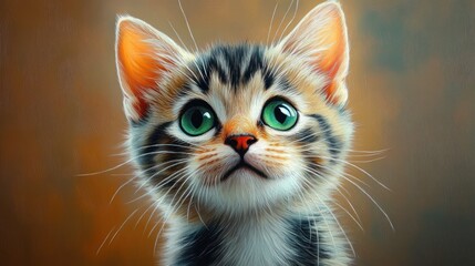 wide-eyed tabby kitten with bright green eyes and striped fur looking upward with curious innocent expression, soft whiskers and warm background