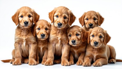 Six golden retriever puppies sit together on a white background. Their soft fur and innocent eyes create a heartwarming scene. These adorable young dogs are playful and full of energy.