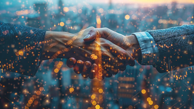 Double exposure of financial graph on cityscape background with two businessman handshake. Concept of stock market deal