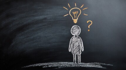 Concept of creativity and innovation represented by a figure with a light bulb over their head, symbolizing ideas and inspiration on a black chalkboard background