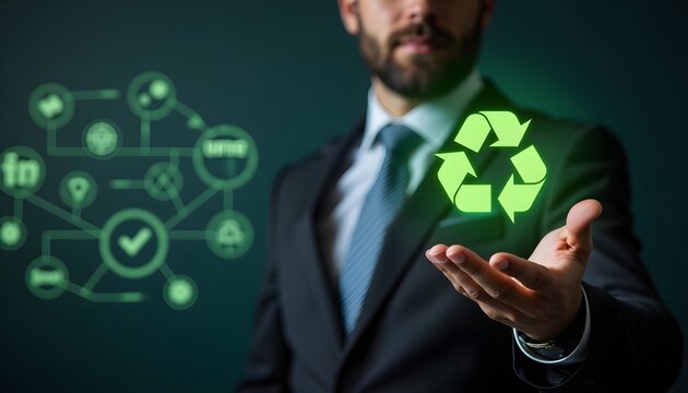 Businessman Holding Green Recycling Symbol in Front of Digital Network Graphics