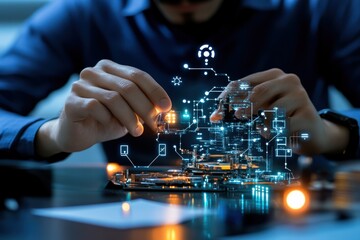 Hands Working on Futuristic Digital Circuit Board Innovative Technology Concept
