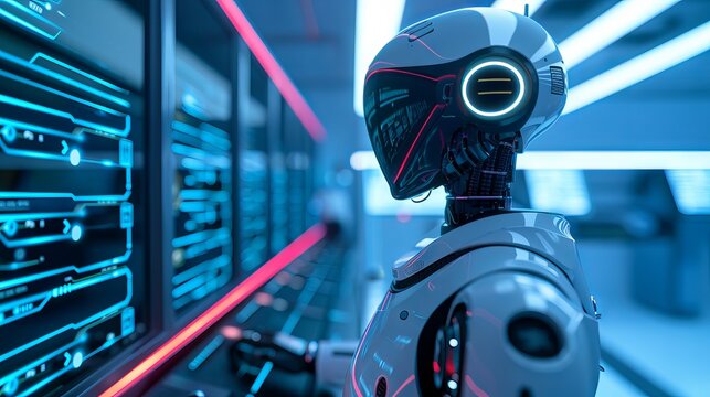 Futuristic robot analyzing data on digital screens in a high-tech lab. Concept of artificial intelligence and advanced technology.