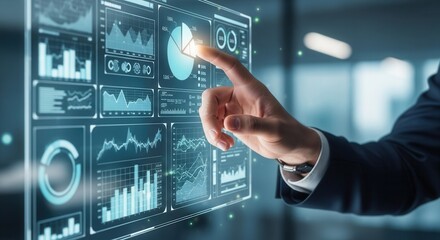 Digital Transformation: A close-up shot captures the moment a business executive engages with an interactive digital interface, showcasing advanced data analytics and innovative tech