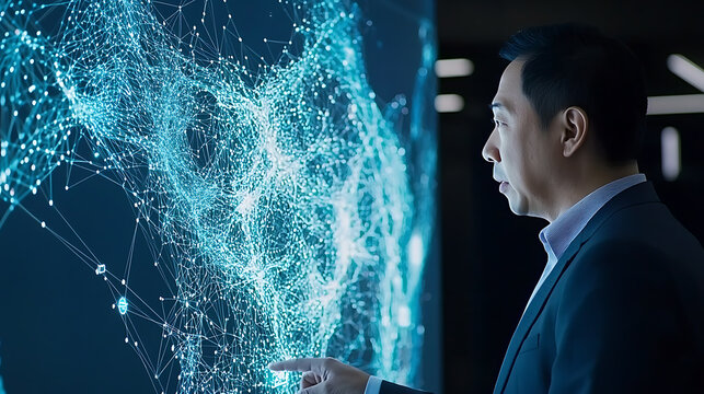 Man stands in futuristic cityscape. Orange bokeh lights create data streams, digital connections, artificial intelligence concept. Modern tech, innovative design, cyber world, business technology.