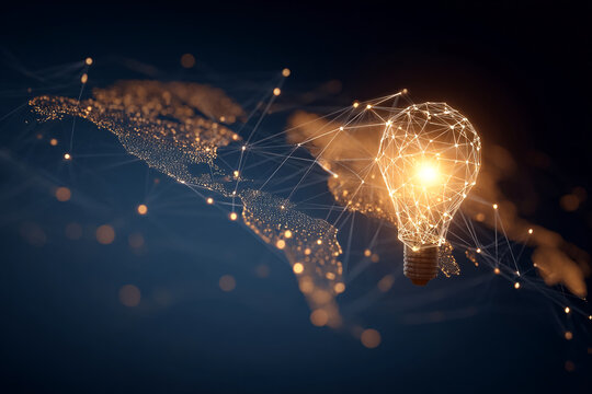 Innovative corporate leader showcasing advanced environmental technology with glowing light bulb symbolizing ideas and data visualization