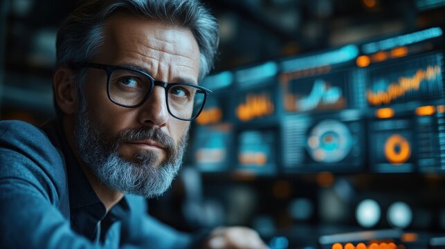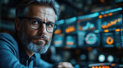 Business concept images, clear concept, valuable images  man interacting with a futuristic transparent screen displaying ai and data visualizations on a desk