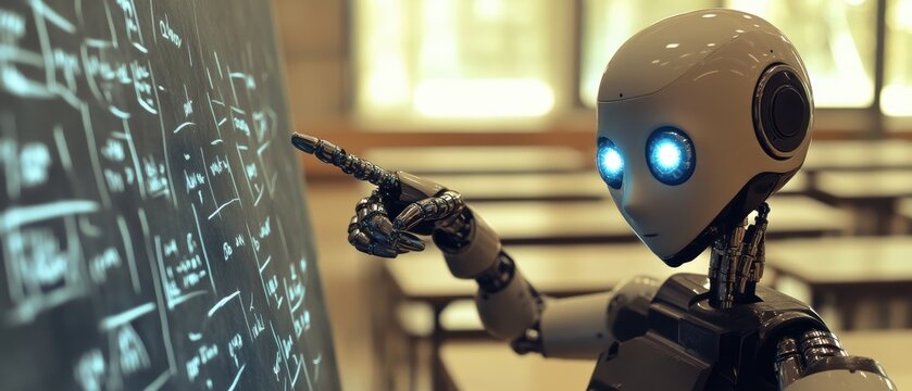 Robot teaching in a classroom, presenting formulas on a blackboard for education, AI technology, and innovative learning methods in the digital age.