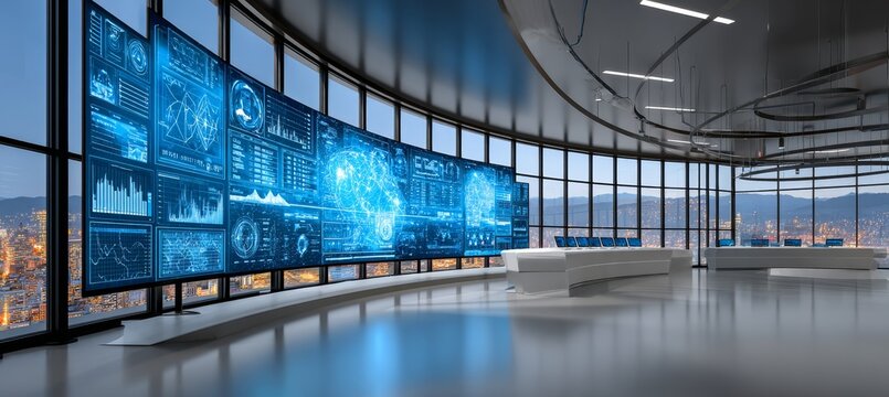 Futuristic Control Room Featuring Advanced Technology and Virtual Reality Data Visualization Tools
