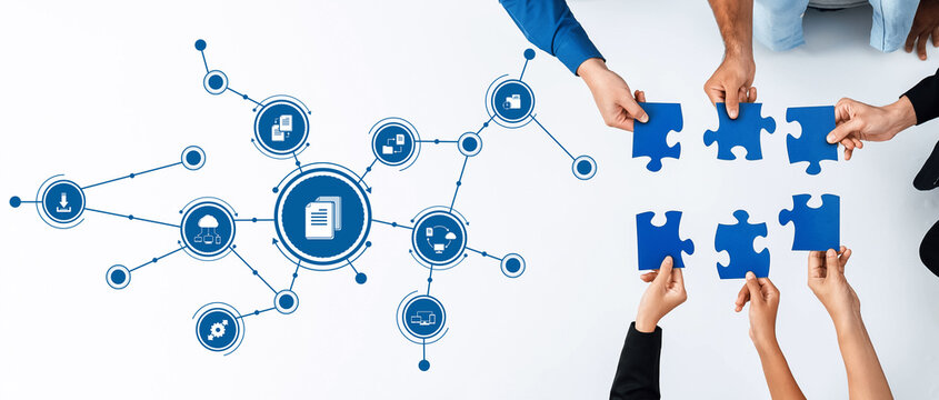This image showcases a collaborative management concept featuring hands joining puzzle pieces amidst a network of connections, symbolizing teamwork and innovative solutions in business. Amity