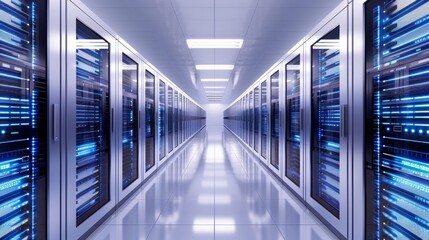 Modern data center hallway with rows of illuminated server racks enhancing high-tech infrastructure and advanced digital storage environment