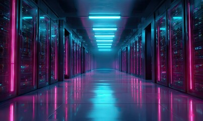 Neon-lit server room corridor; rows of data storage units, reflecting vibrant pink and blue light on polished floor