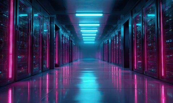 Neon-lit corridor of futuristic servers