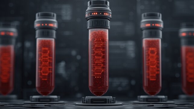 Futuristic laboratory with glowing red liquid in test tubes showcasing advanced technology concepts and scientific research in a high-tech environment