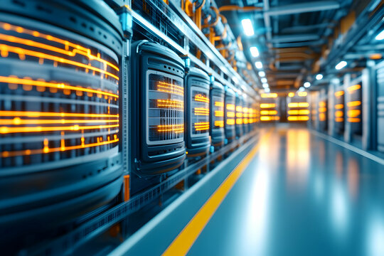 Low angle view of data center server room with rows of equipment. Blinking blue, pink, yellow, red lights on network devices. Futuristic technology infrastructure provides high efficiency,