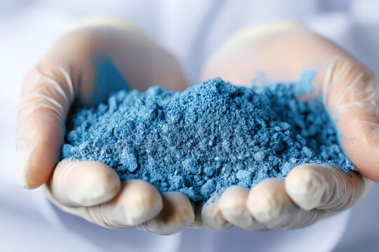 Scientific hands holding blue powder showcasing analytical processes and material properties in a dynamic laboratory environment reflecting innovation and precision