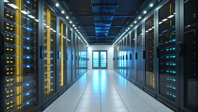 An advanced server room wih blue lighting, filled wih servers and digital equiment, representing data an technology.